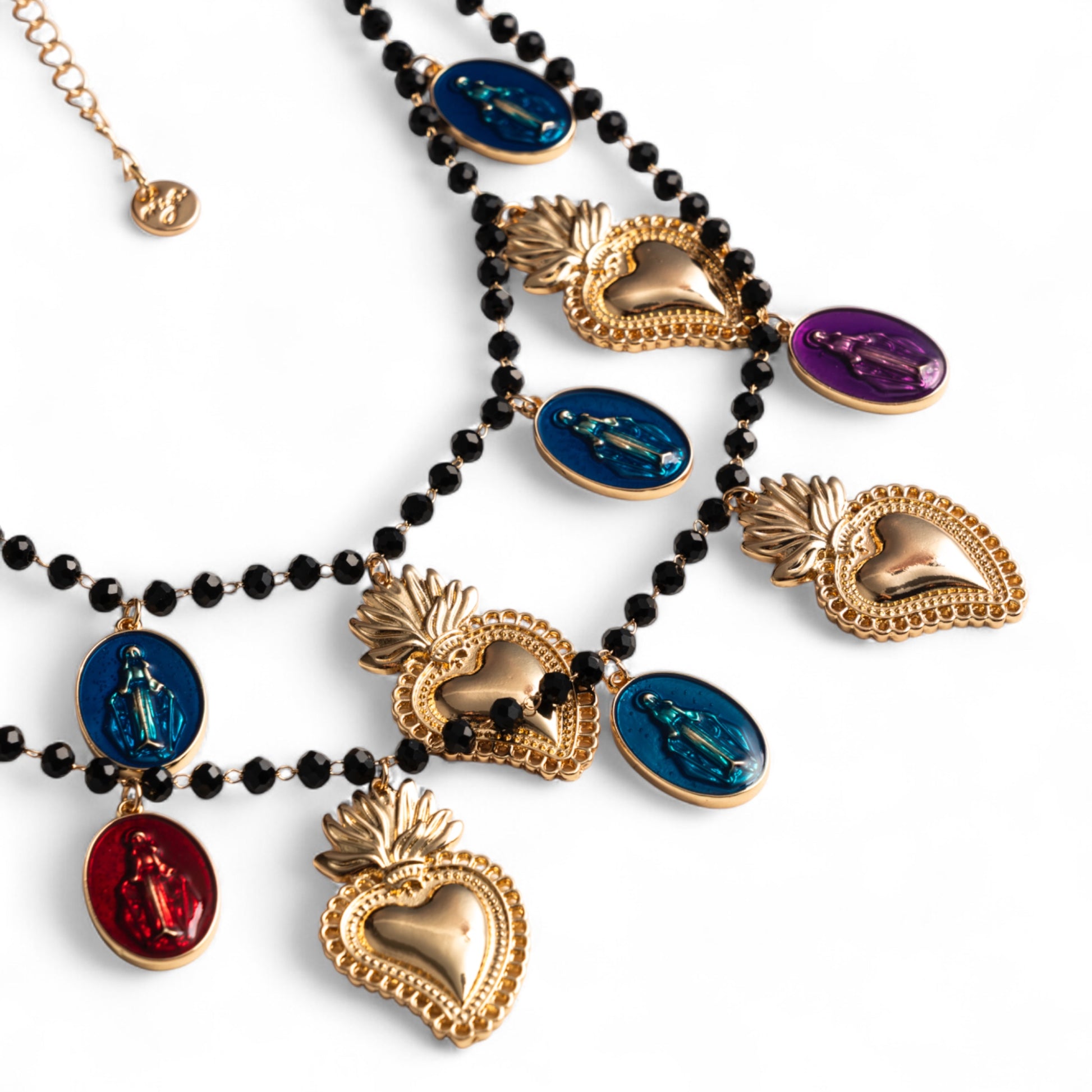 Collana a due fili con pietre in vetro nere e charms pendenti in metallo con cuori sacri