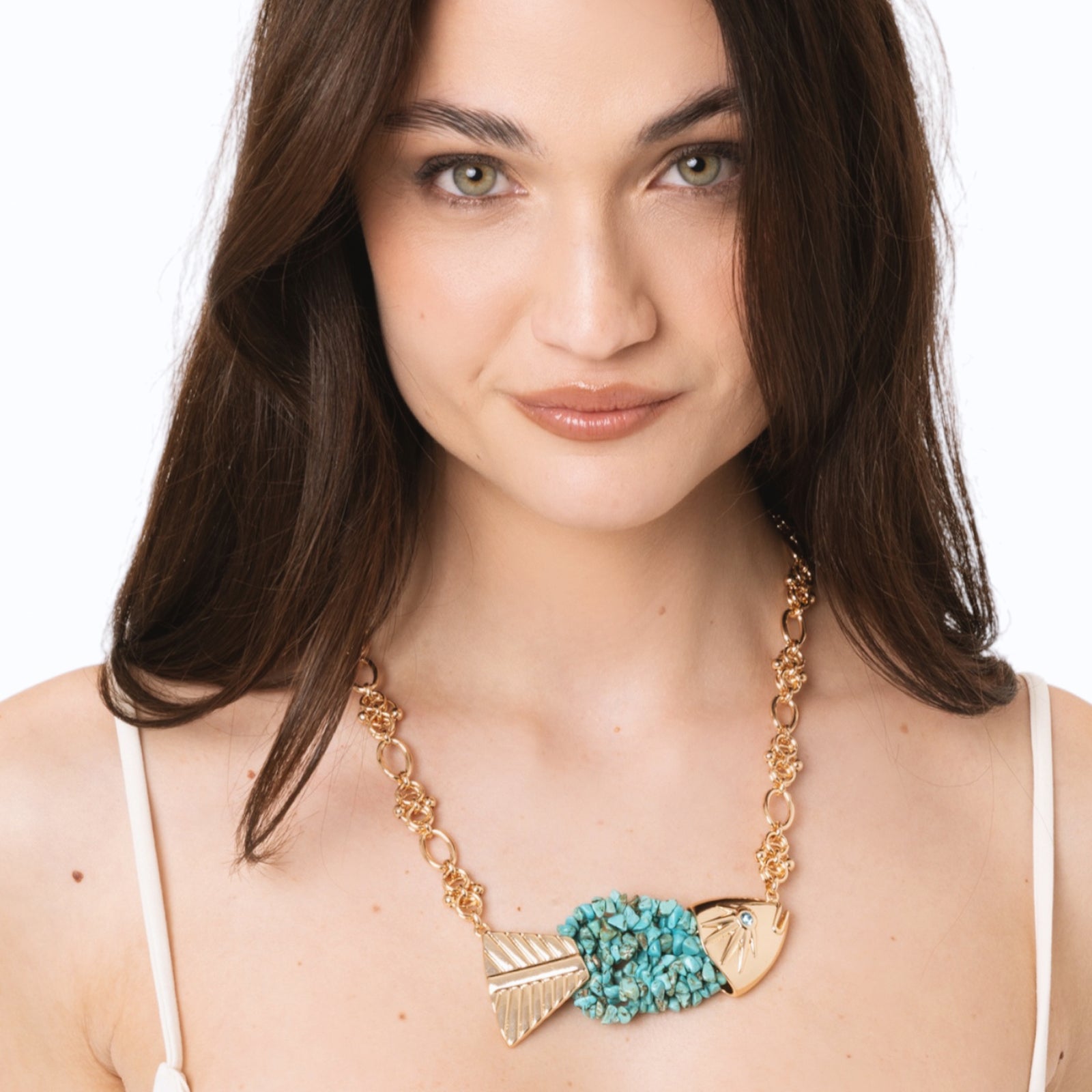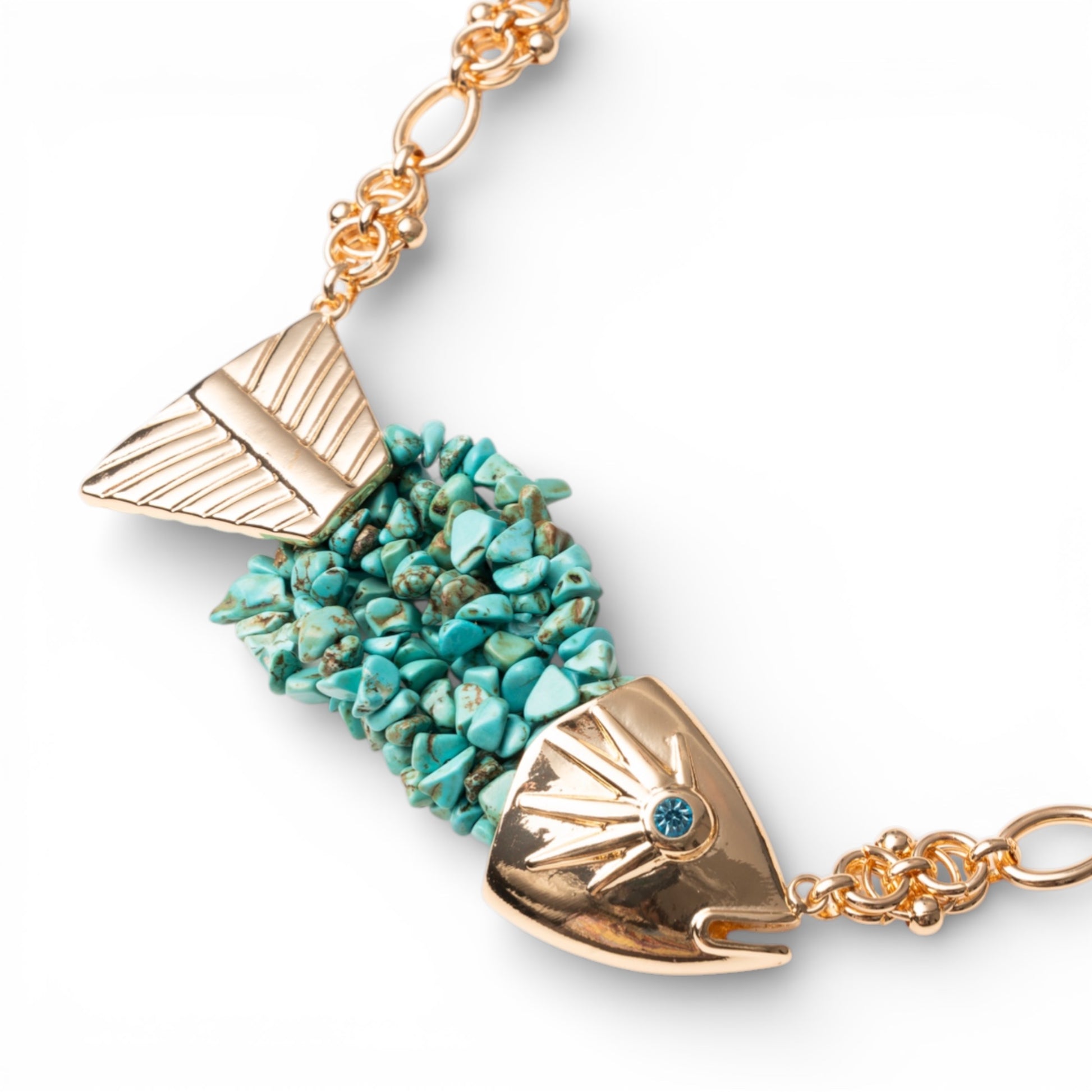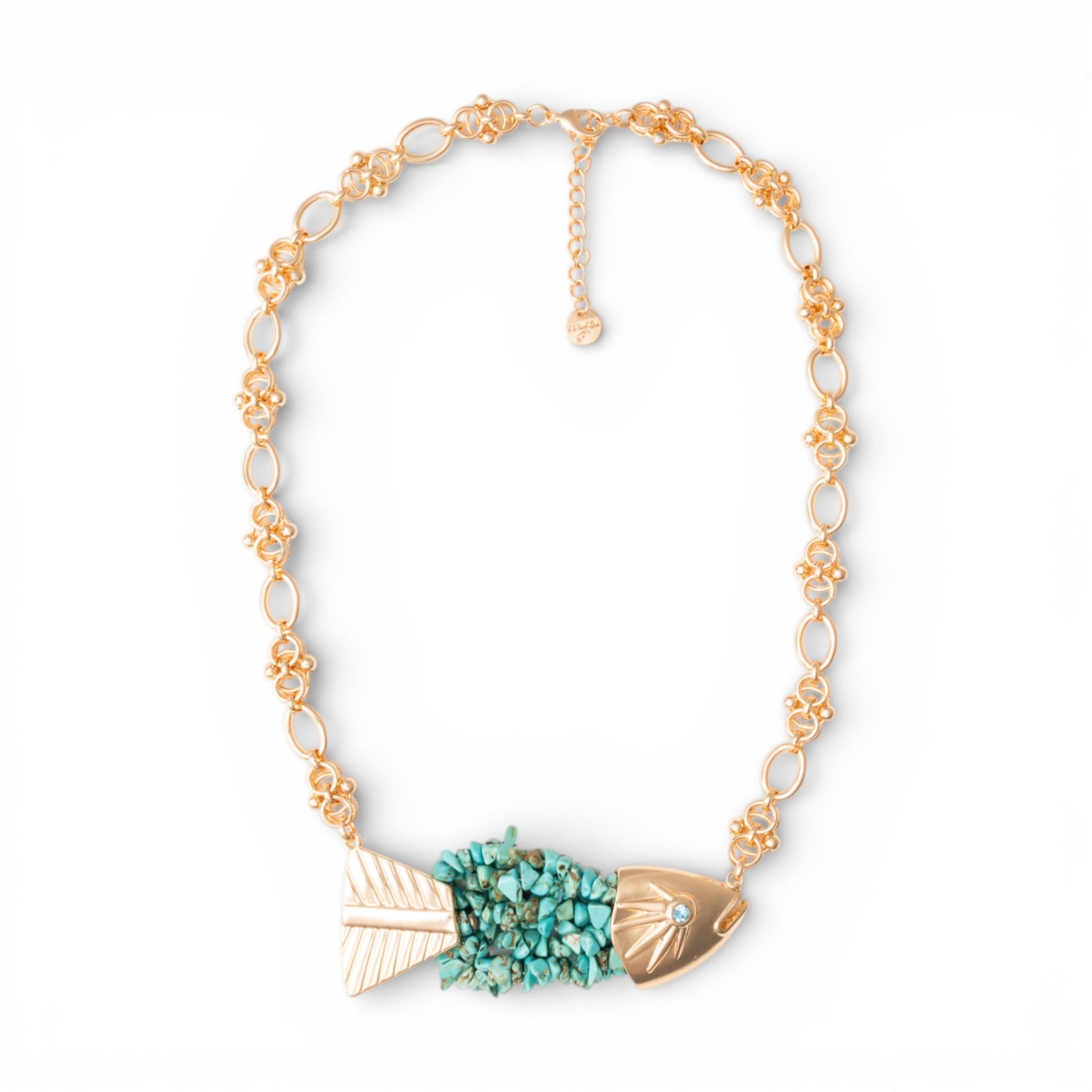 Collana girocollo a catena con pendente a pesciolino ricoperto di conchiglie turchesi