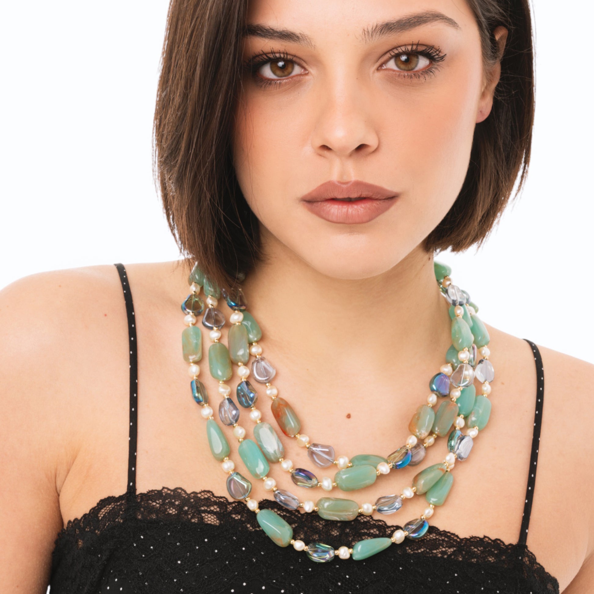 Collana girocollo multi filo con pietre vetro ed acrilico tono verde