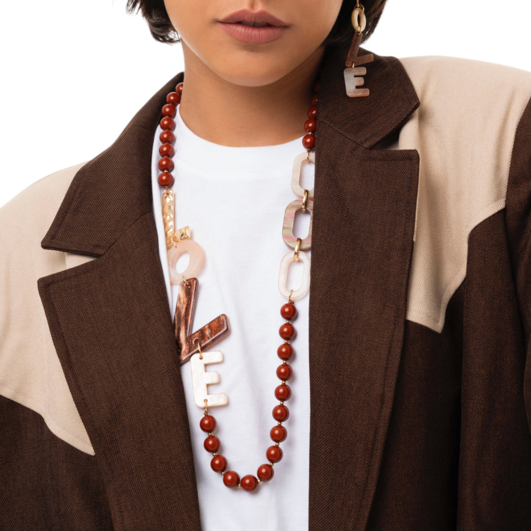 Collana lunga con sfere marroni ed inserti in acrilico con scritta love
