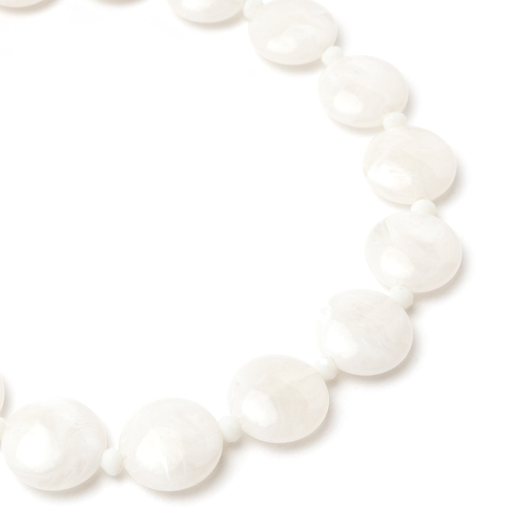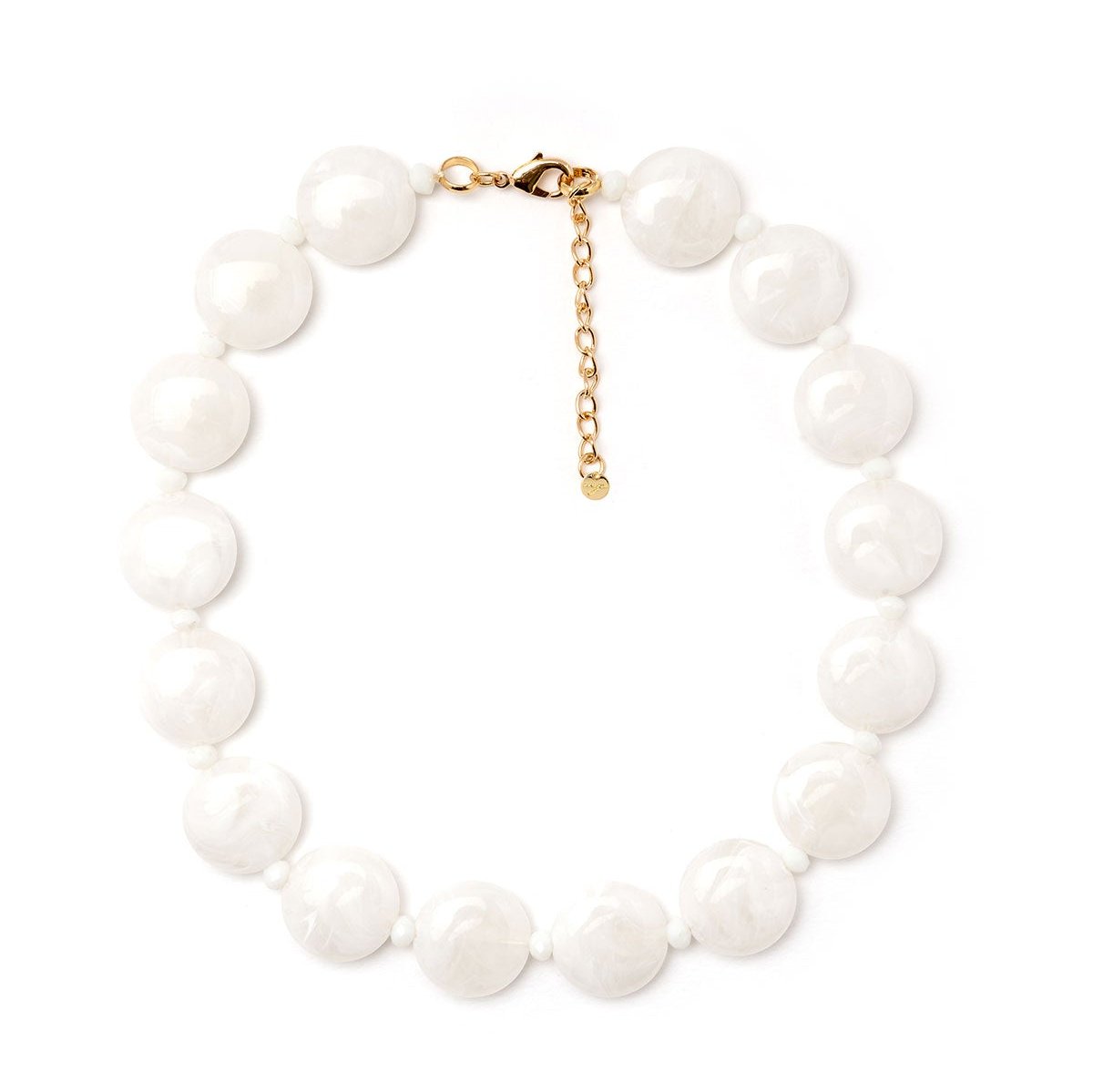 Aggiungi un tocco di freschezza al tuo look estivo con questo gioiello dallo stile unico e moderno. Mya Accessories propone un girocollo dal design molto pulito e geometrico. Si presenta a base circolare, in acrilico di colore bianco. Chiusura regolabile, ad aragosta, in metallo colore oro. Confezionato in sacchetto TNT di colore beige.