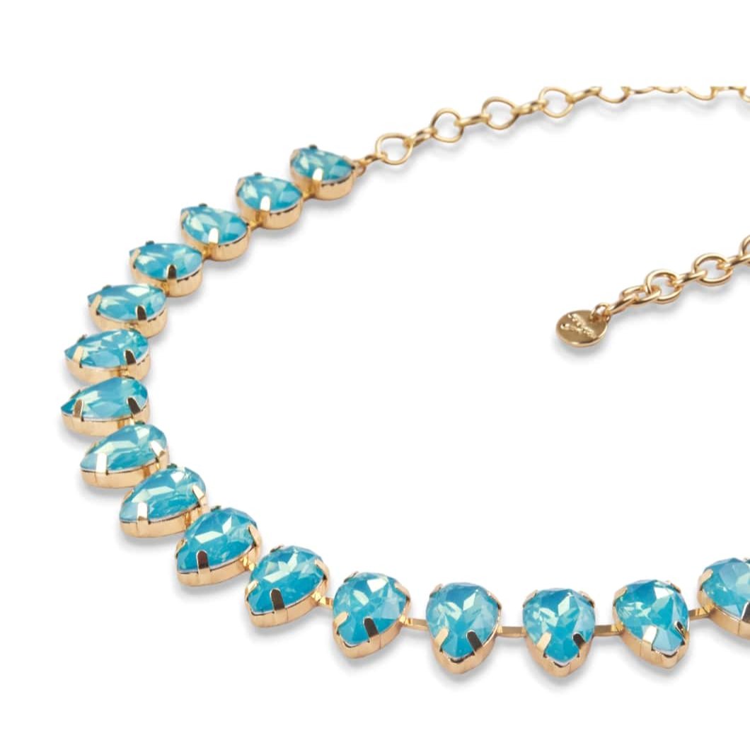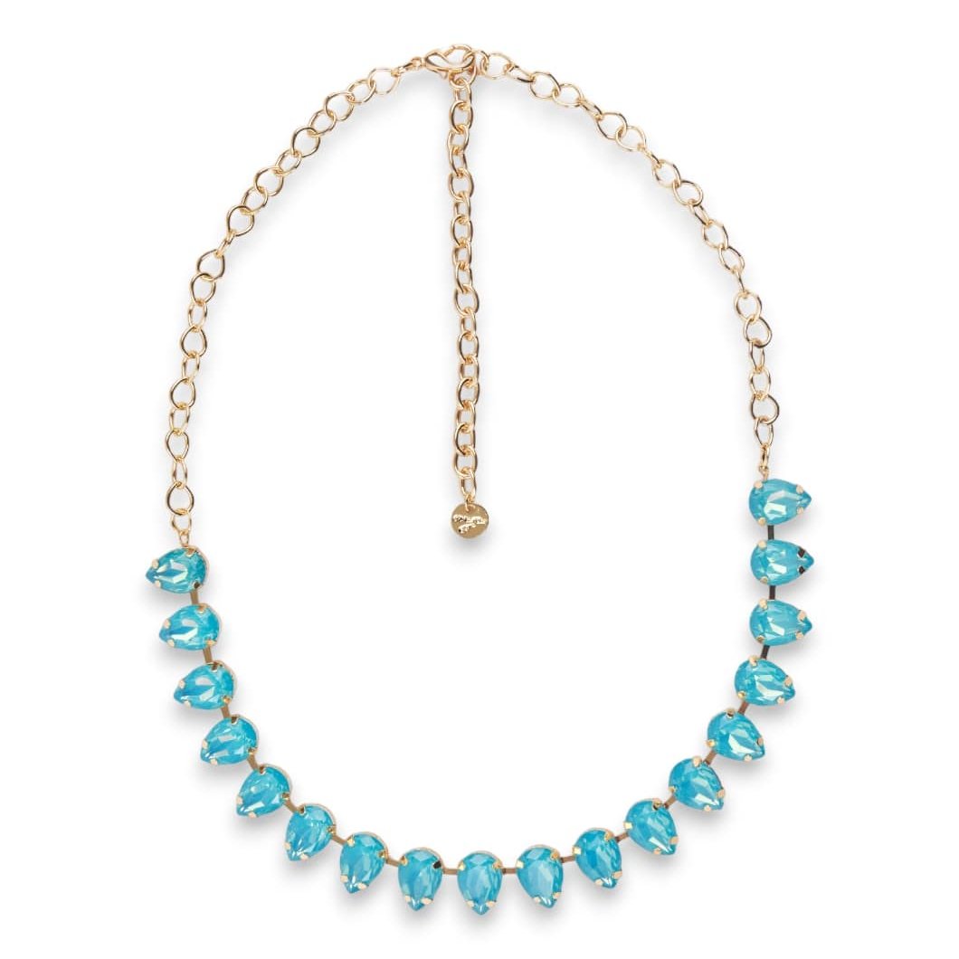 Questo girocollo di alta qualità è realizzato in pregiato metallo color oro e impreziosito da meravigliosi gioielli a goccia di vetro blu. Il design è sofisticato ed elegante, con un contrasto armonioso tra il caldo tono dell'oro e la fresca tonalità blu dei gioielli. La lunghezza della catenina è perfetta per adattarsi a diverse taglie di collo, garantendo una vestibilità comoda e adatta a ogni occasione. Questo girocollo è la scelta ideale per coloro che desiderano un accessorio unico ed esclusivo.