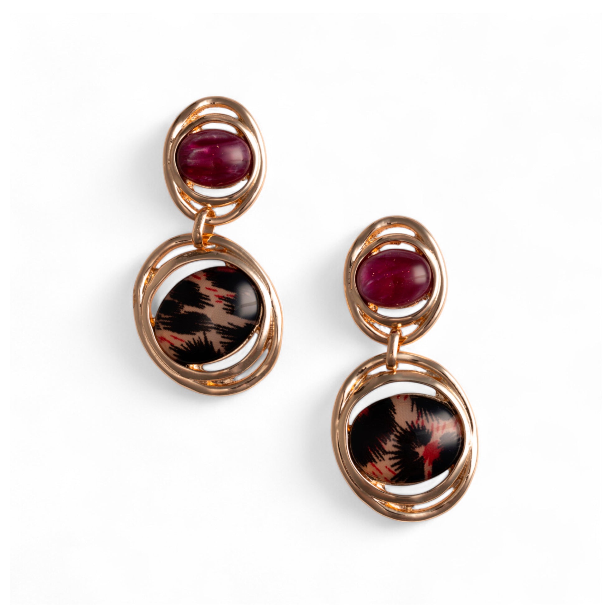 Orecchini pendenti in metallo a base circolare con pietra in acrilico animalier rossa