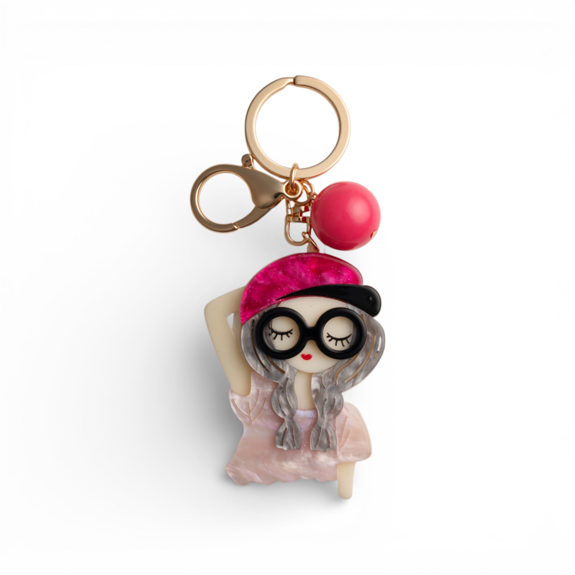Portachiavi in metallo con charms ragazza col berretto in acrilico