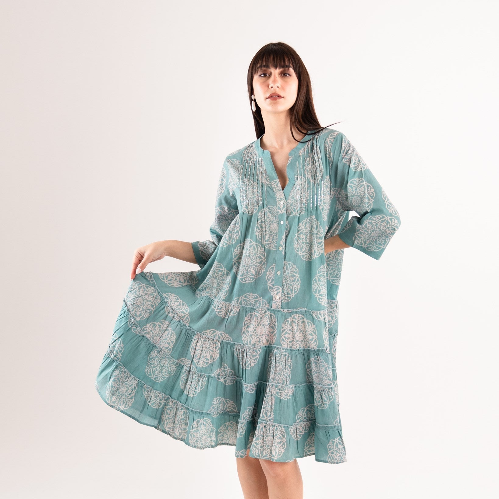 Fresco, vivace e leggero: il vestito in cotone turchese corto con stampa bianca è il capo perfetto per i tuoi look estivi. Realizzato in cotone traspirante, garantisce comfort e freschezza durante tutta la giornata, senza rinunciare allo stile.